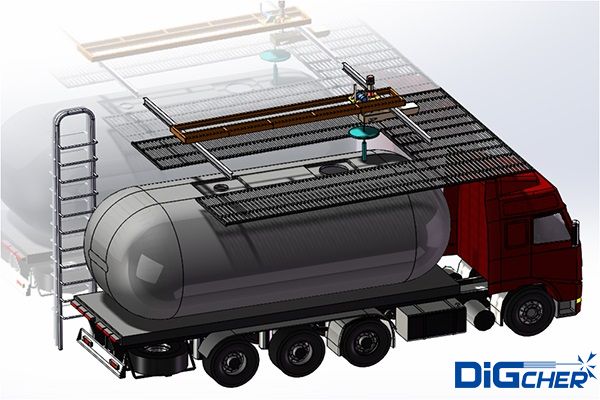 4、罐車停到清洗工位后,三坐標(biāo)軌道對位機(jī)構(gòu)可以在X和Y方向調(diào)整,以便清洗機(jī)構(gòu)可以對正罐口。或者在棧橋左右兩側(cè)停車工位之間轉(zhuǎn)換,提高清洗機(jī)構(gòu)使用效率;